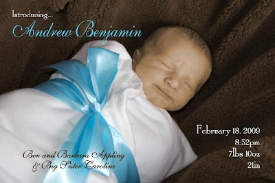 He is doing great! At his 1 month visit, he weighed 8lbs 6oz. We did have to take him to a Pediatric Cardiologist for an echo and EKG due to a slight heart murmer...and thankfully, that is all it was a "slight" murmer (no follow-up needed). God has blessed us with a healthy baby boy who by all accounts is doing well. He is very active and is always on the move --diapering and bathing him are challenges as he likes to kick and move so much. His sleep habits are where they should be for 6 weeks anywhere from 7hrs then 3 hrs or two stints of 4-1/2 to 5 hrs at night (I really can't complain). He seems to only cry when he has gas (which is often .... again total BOY!), is tired or hungry. Caroline continues to love "Baby An-rew" and can't wait until he is big enough to play "chase" with her.